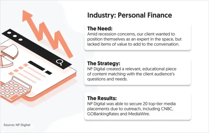 That’s the exact approach my digital marketing agency used to get 20 top-tier media links like CNBC and Retail Wire for one of our clients in the personal finance industry.